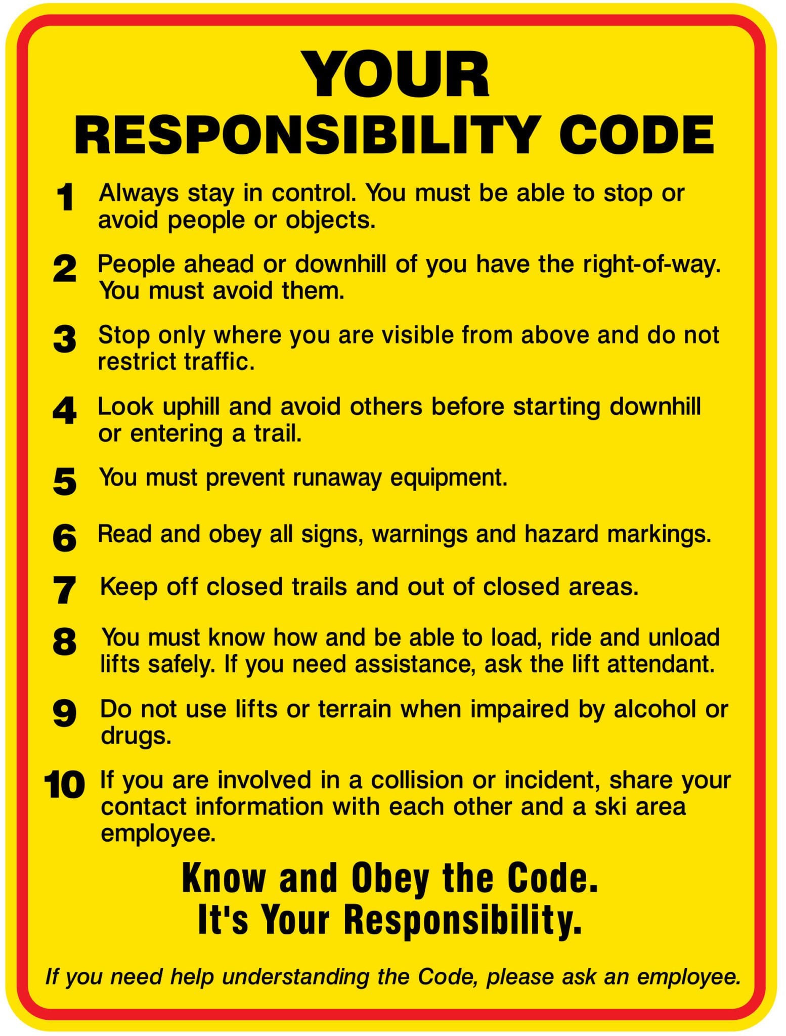 All skiers and snowboarders, whether new or experienced, should know and follow the code of responsibility to ensure their own safety and the safety of others.
